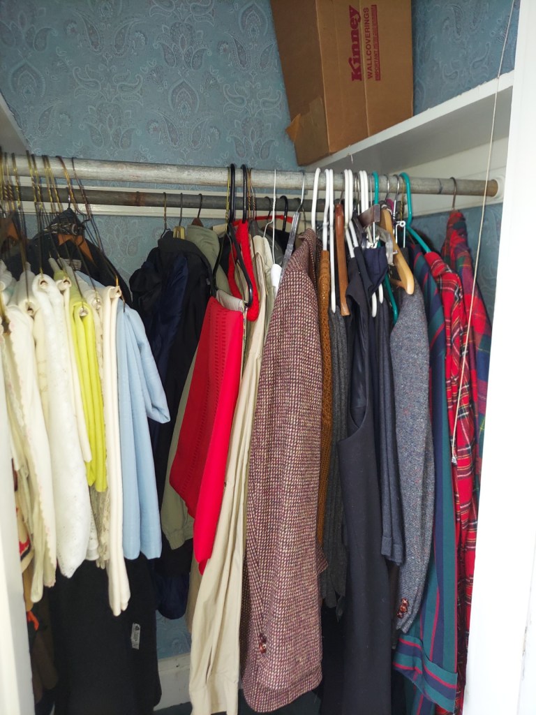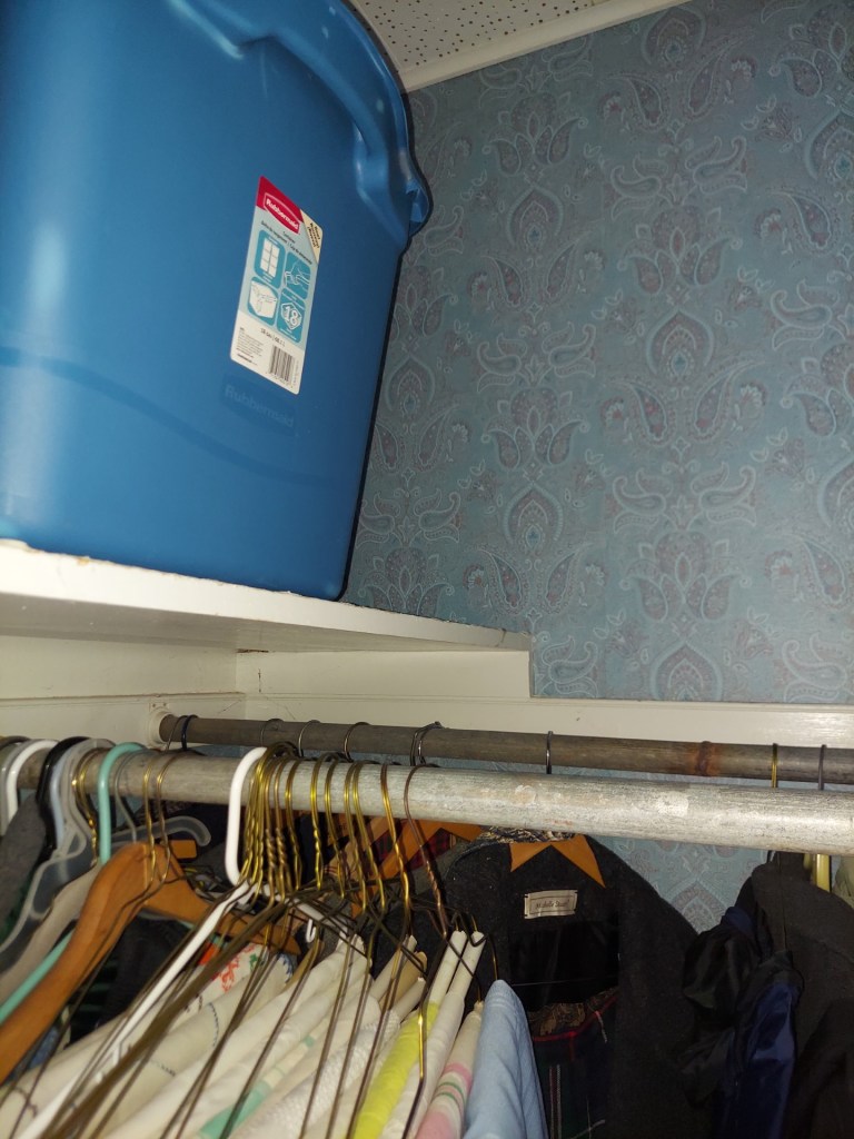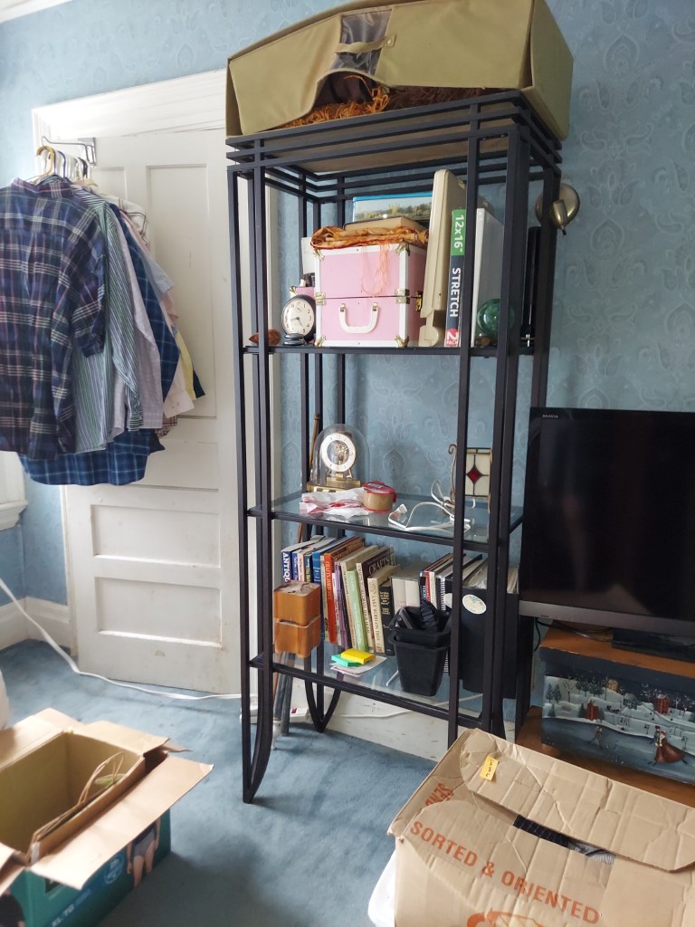 While I was working in the bathroom, Cindy sorted in the blue room. We were able to get nearly everything in boxes and bins. That I could then put in the corner of the hallway that I had emptied earlier by bringing its previous contents to the front parlor…and when you finish bringing boxes and bins to the front parlor, you are definitely going to want a cookie 🍪🤣