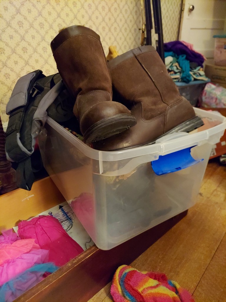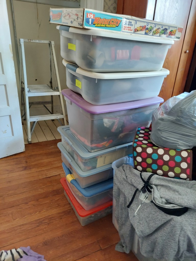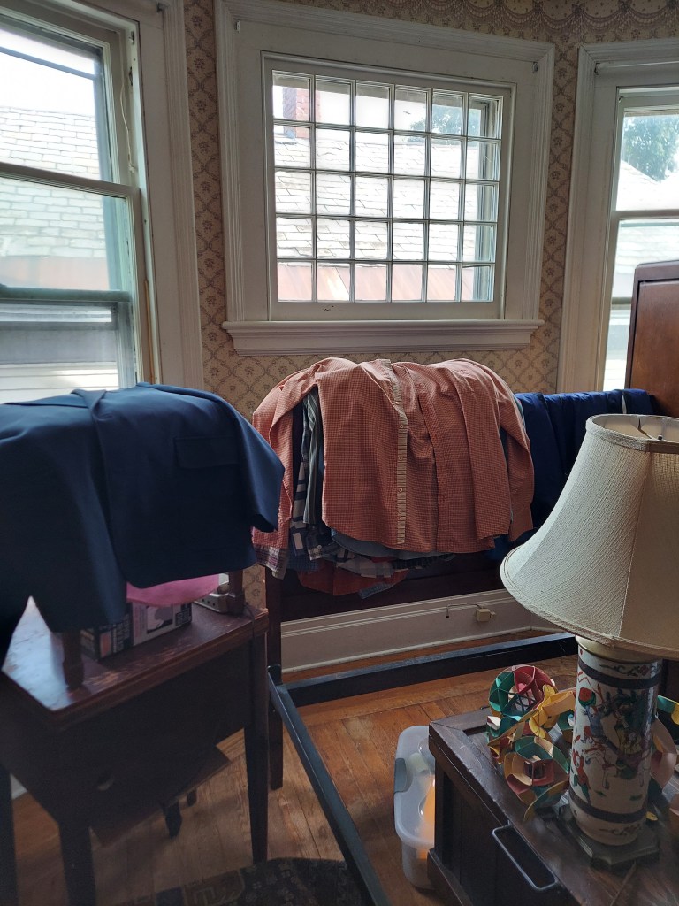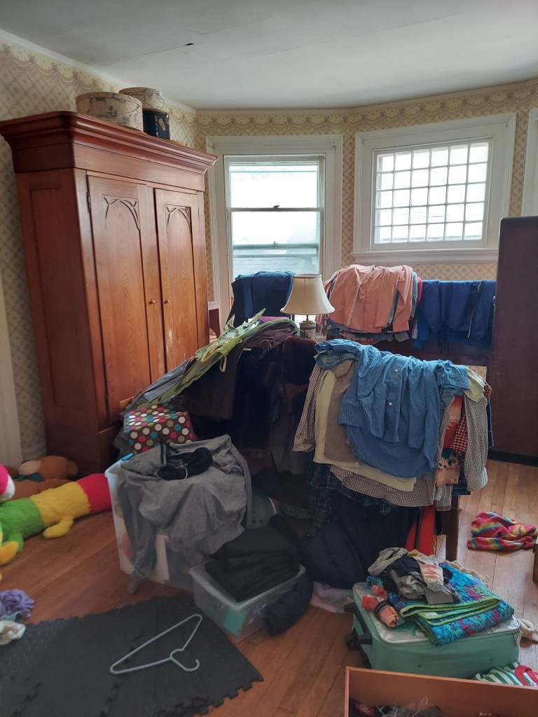 Our 10-year-old’s room is…chaos. When we moved in, the rug for her room was out to be cleaned, so there wasn’t much point in getting things set up in there. The furniture is a jumbled mess, including a full-sized bed frame that will be going away. The bed frame is, in turn, covered with clothes from the closet in our bedroom, because that was the best place to put them during the chaos of move-in. Those clothes are all going away. But, before that, they need to be sorted into piles for specific people, to be sold, or to donate.