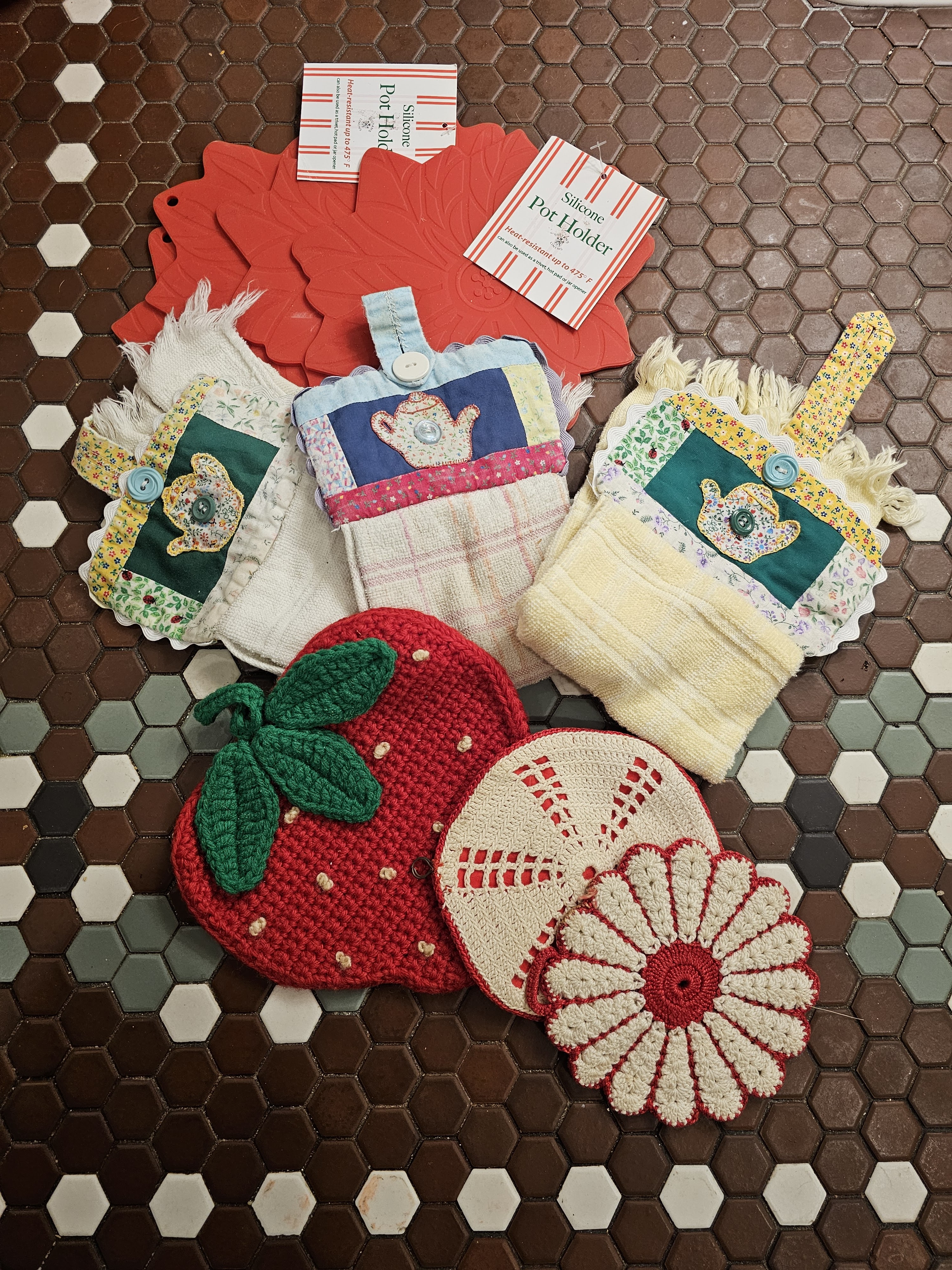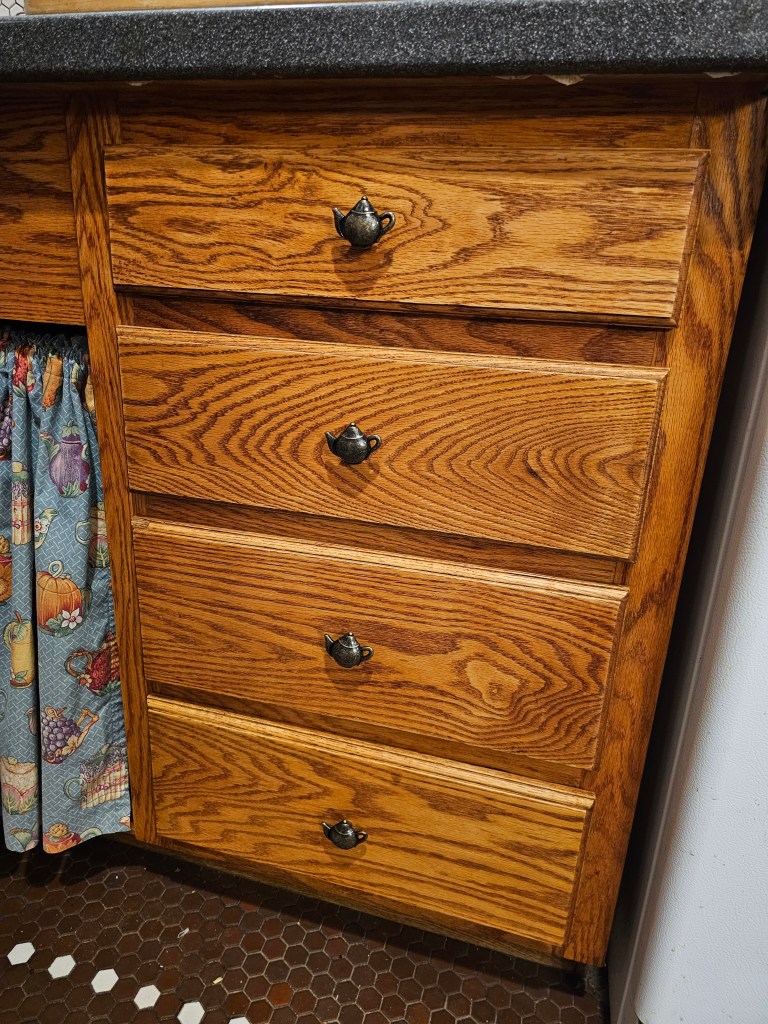 Before installing the new pulls, I had to clean, of course! I emptied all the drawers, washed inside, and scrubbed at the drawer fronts with a green scruffy…when that clearly wasn’t enough, I scrapped off the years of grease and grime with a paint scraper 🙃. Once they were clean enough, I hit them with a fine grit sandpaper and polished them with linseed oil. Then I added the pulls – teapots, of course 🫖, oiled bronze to compliment both the wood and the brown tile. The wood is positively glowing, and soft and silky to the touch…it’s a genuine pleasure to use these drawers now 😄
